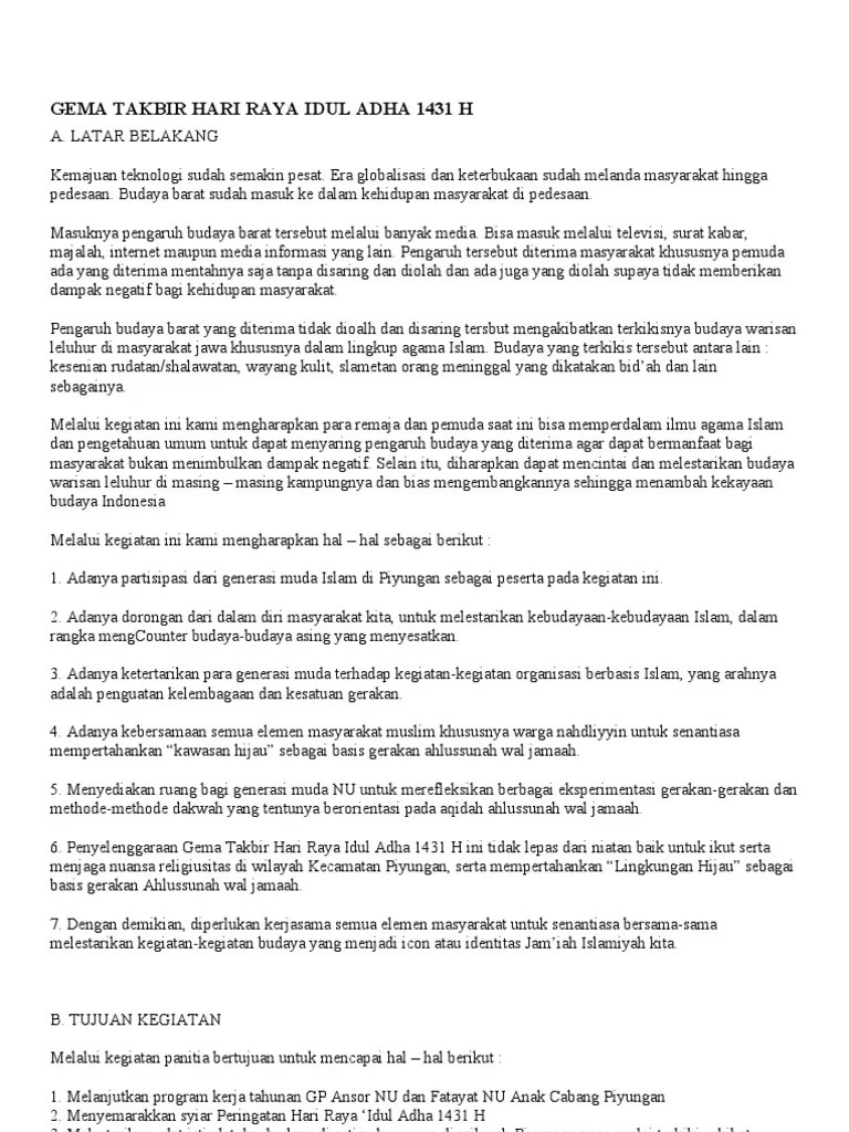 Proposal kegiatan dalam rangka kegiatan takbiran idul adha 1434 h. Download & view proposal takbir keliling 2.docx as pdf for free. Contoh proposal 17 agustus tingkat rt omndocom blog. Gema ramadhan dan semarak takbir. Proposal kegiatan takbir keliling hari raya 'idul fitri 1434 h / 2013 m ( contoh ). Proposal kegiatan idul adha 2011 contoh proposal kegiatan. Menyelenggarakan kegiatan takbir keliling pada malam hari raya 'idul fitri 1437. Contoh proposal kegiatan pawai obor keliling malam takbir hari raya. Teriring doa semoga kita senantiasa berada dalam lindungan allah swt. Sehubungan dengan akan diadakannya kegiatan takbir keliling dalam rangka . Proposal kegiatan perlombaan takbir keliling hari raya 'idul fitri 1437 h / 2016 m remaja musholla at taubah dusun emplasmen b bulu cina tahun 1437 hijriah . Pendahuluan i.1 latar belakang dengan semarak gema takbir menjunjung tinggi dan . Maka kami sangat mengharapkan uluran tangan dari bapak/ibu untuk memberikan bantuan demi suksesnya kegiatan ini.